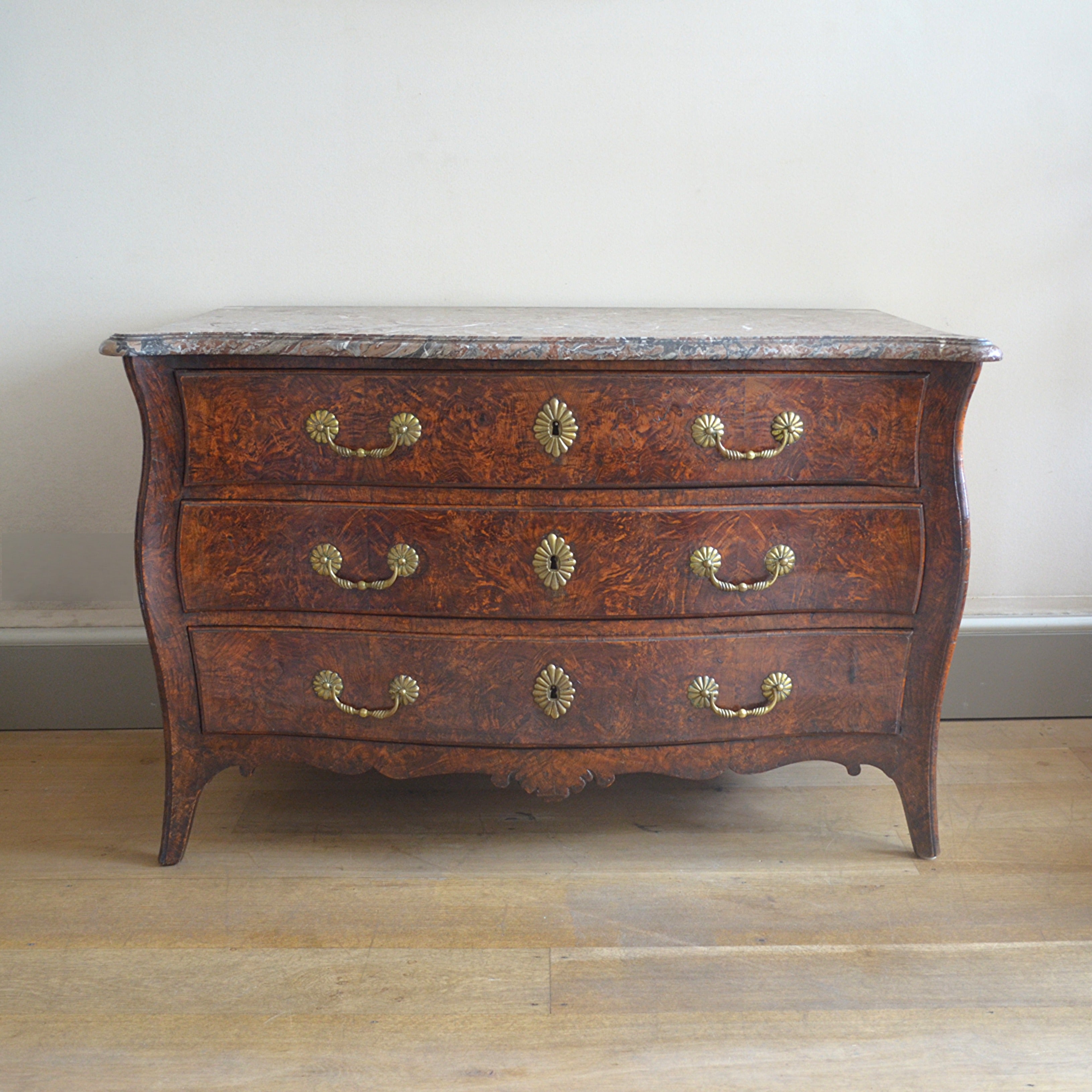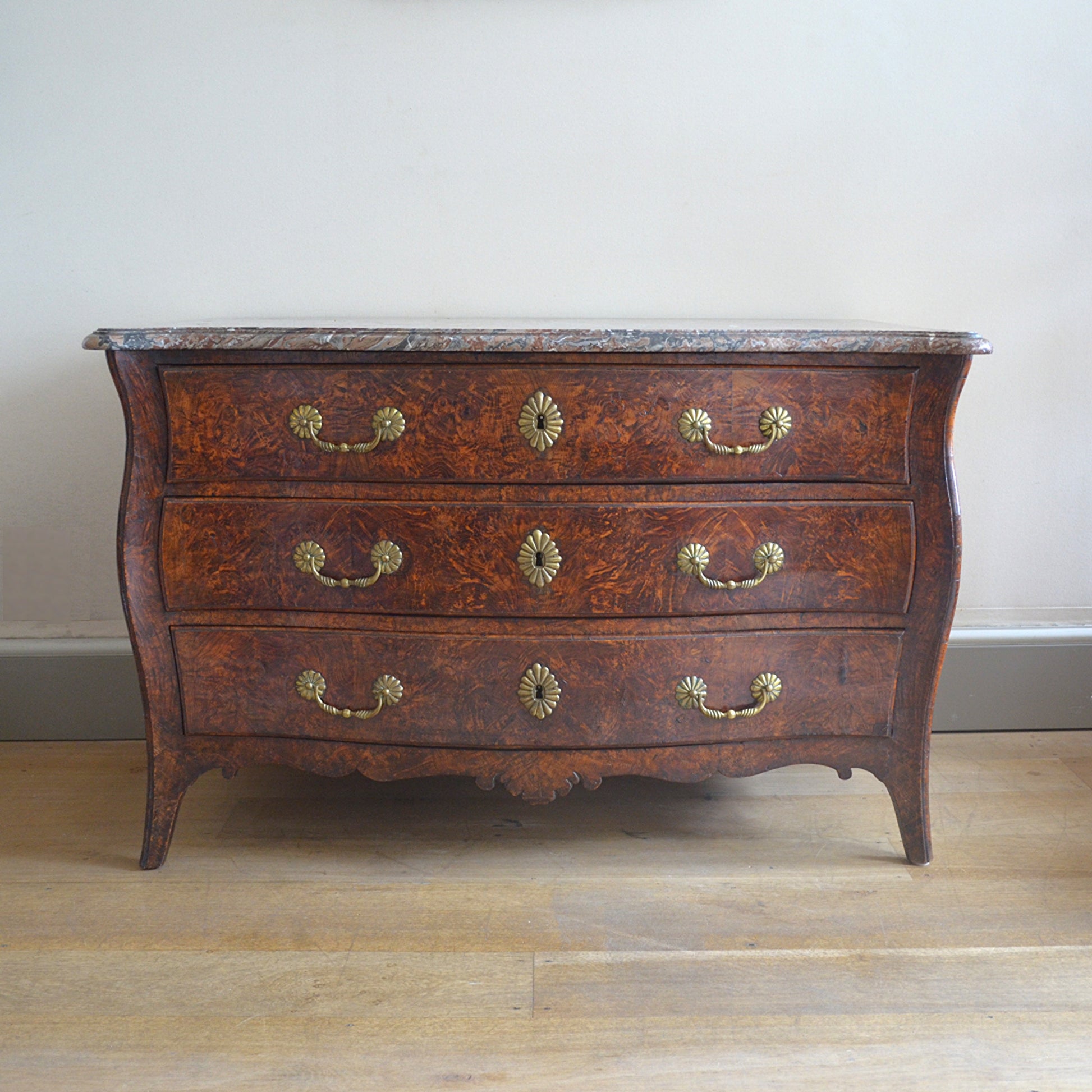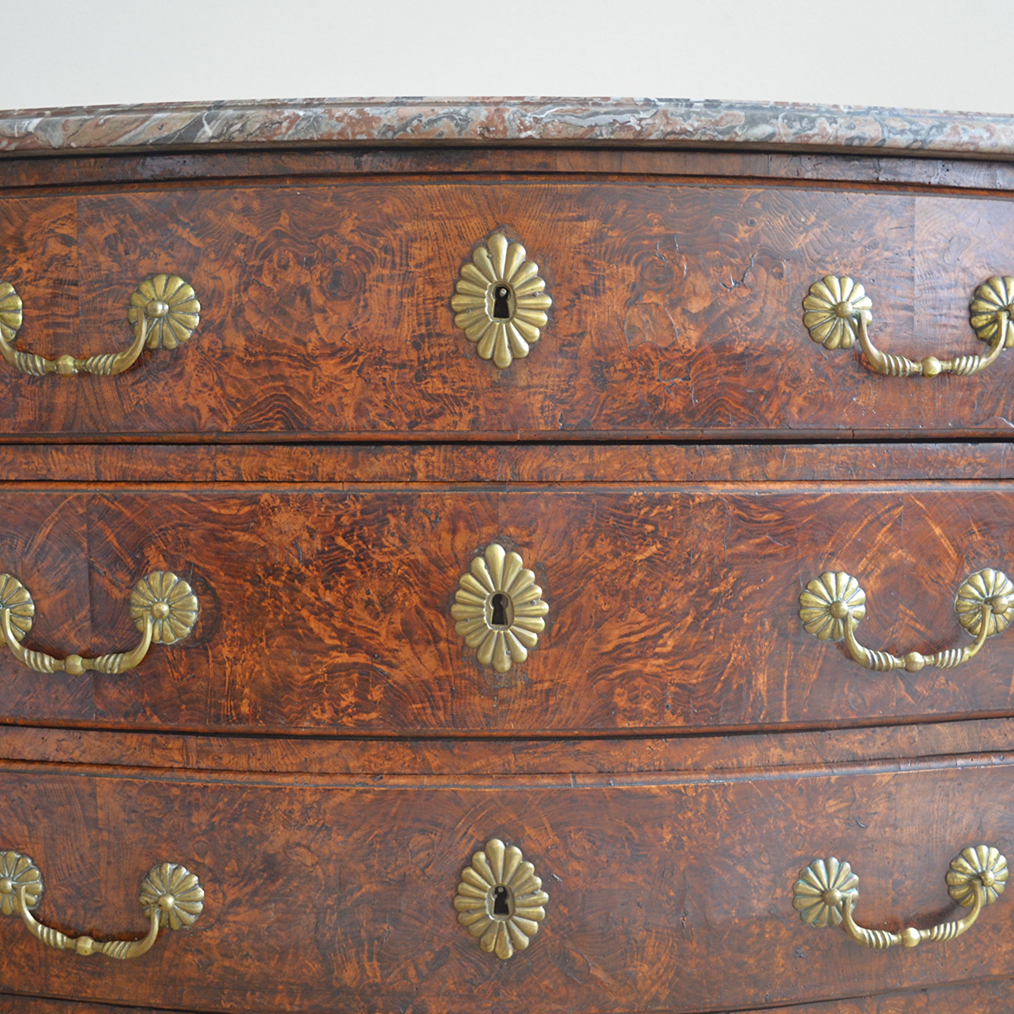 Three-drawer serpentine-fronted burr ash (mimicking tortoise shell) commode, with serpentine marble top above the three drawers, each with sun-burst cast pulls and escutcheons, with shaped frieze.