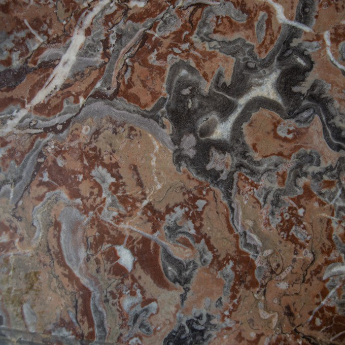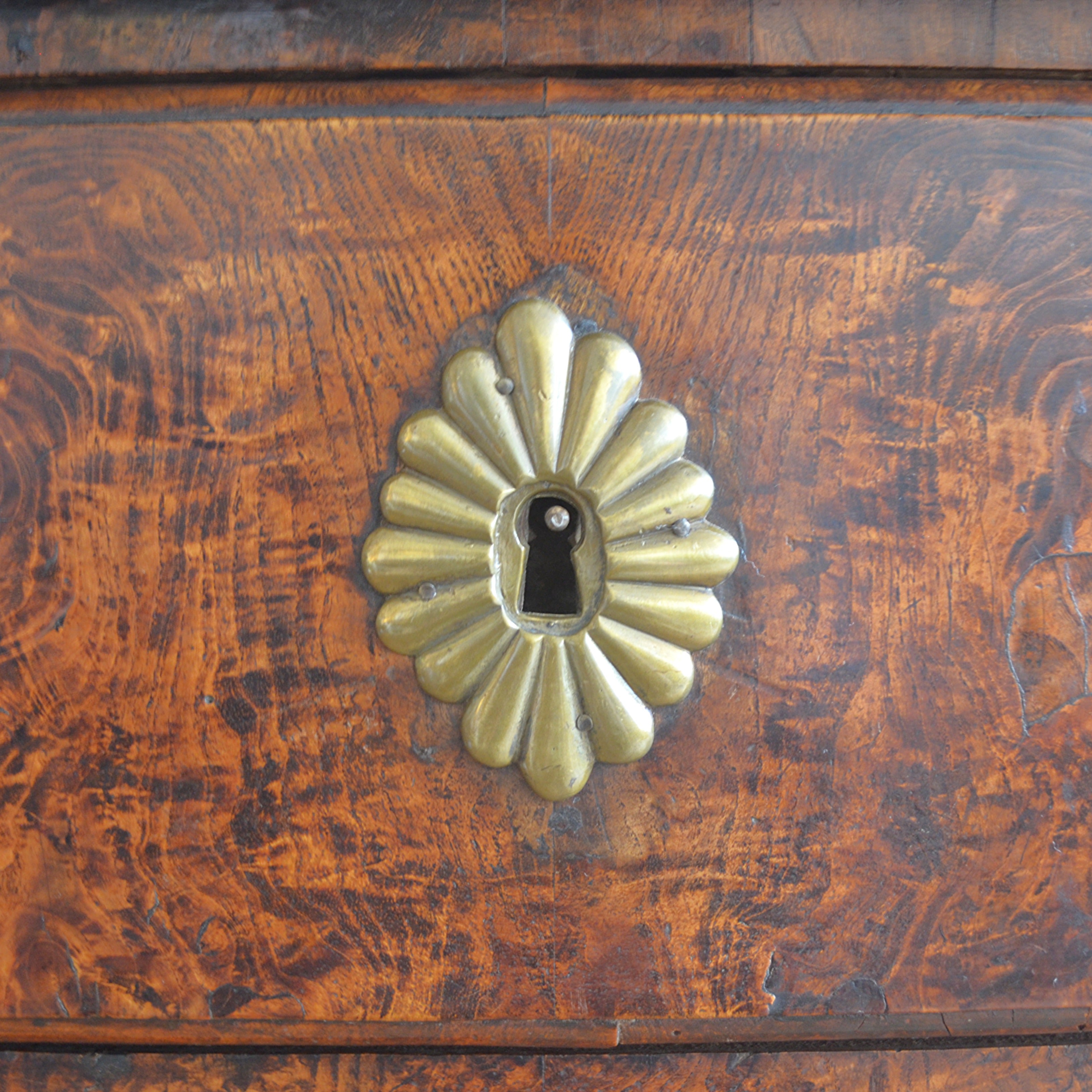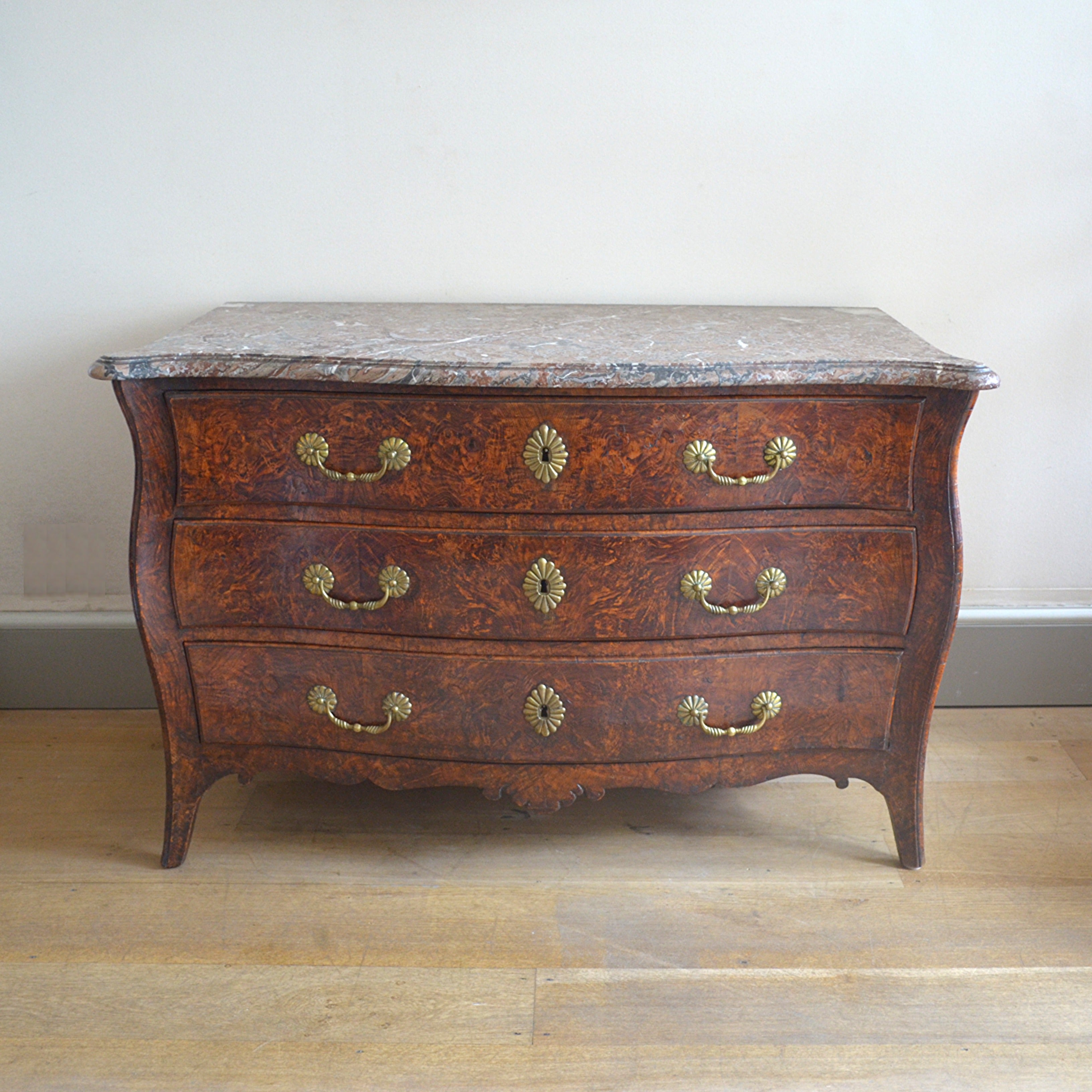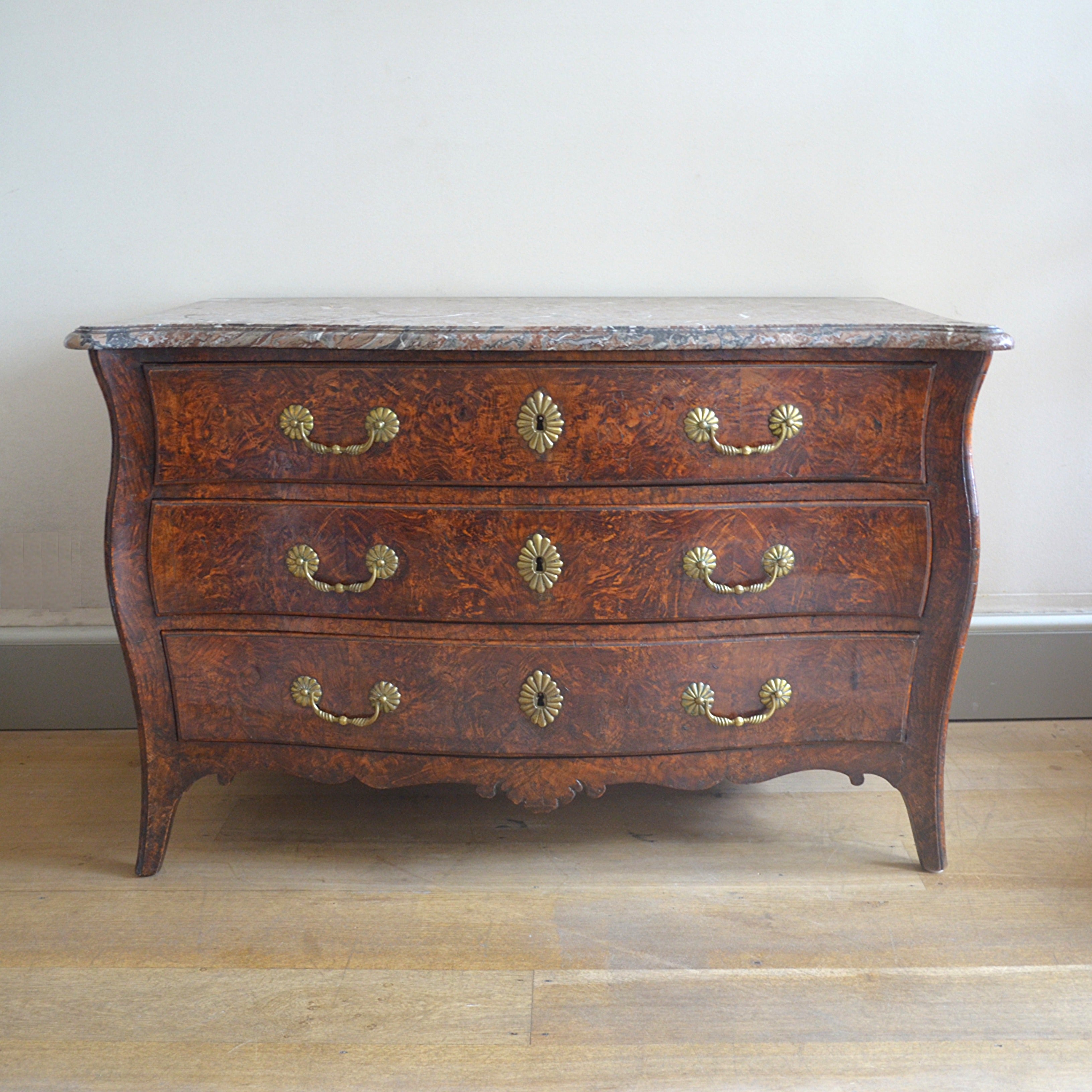 Three-drawer serpentine-fronted burr ash (mimicking tortoise shell) commode, with serpentine marble top above the three drawers, each with sun-burst cast pulls and escutcheons, with shaped frieze.