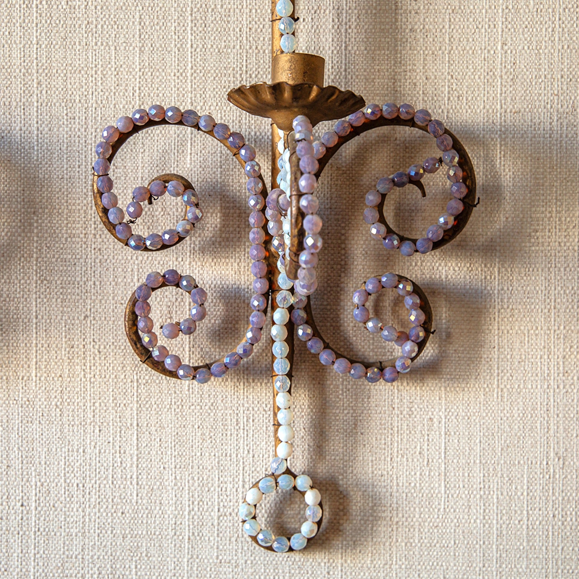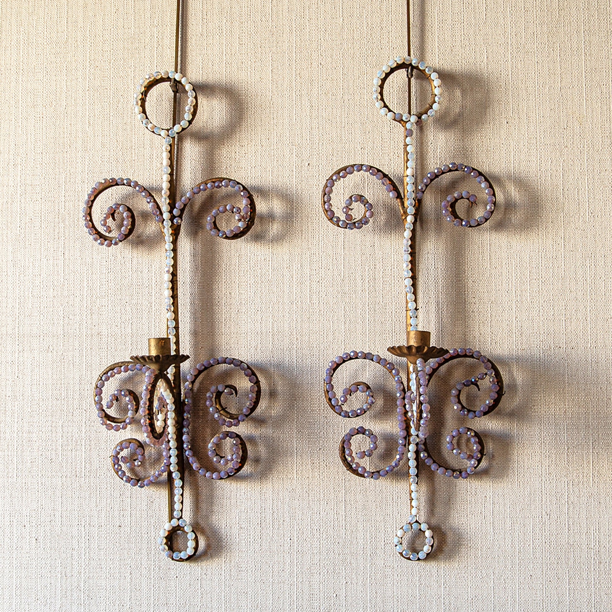 Single-light sconces, with scrolling designs and decorated with faceted iridescent beads, in the manner of Bagues.