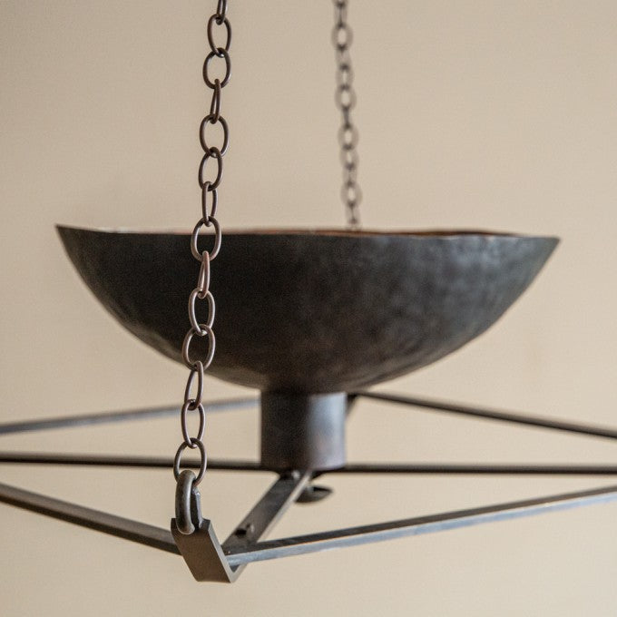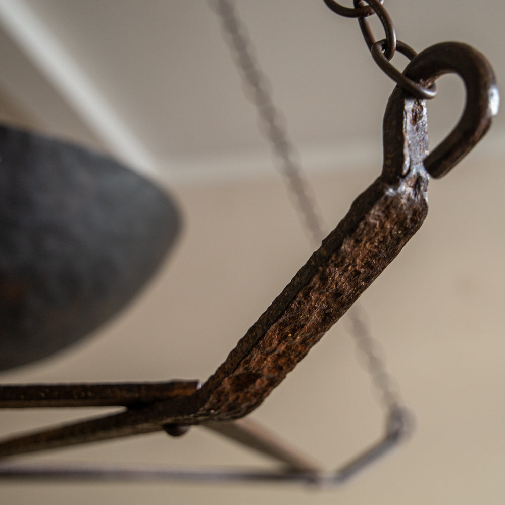 A wrought iron hand beaten x-framed hanging lantern in the Grecian style.