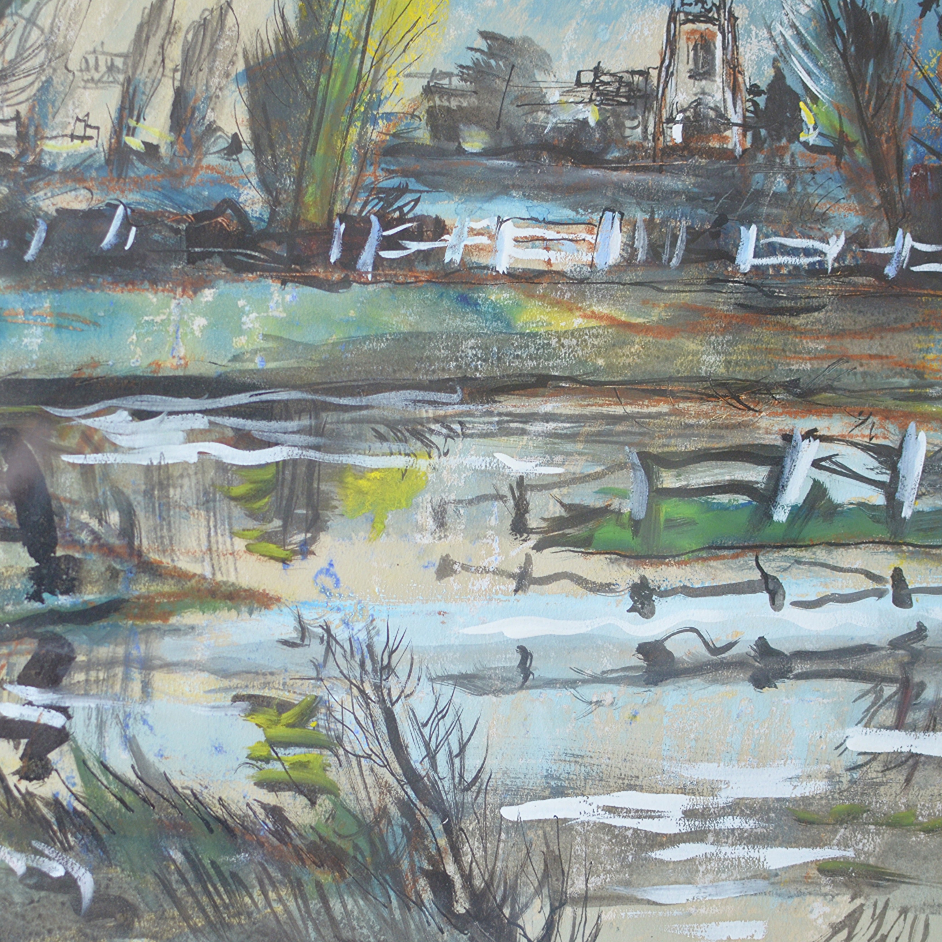 "Flooded Meadows, Clare Sufolk". Watercolour and Indian ink on paper, signed bottom right.