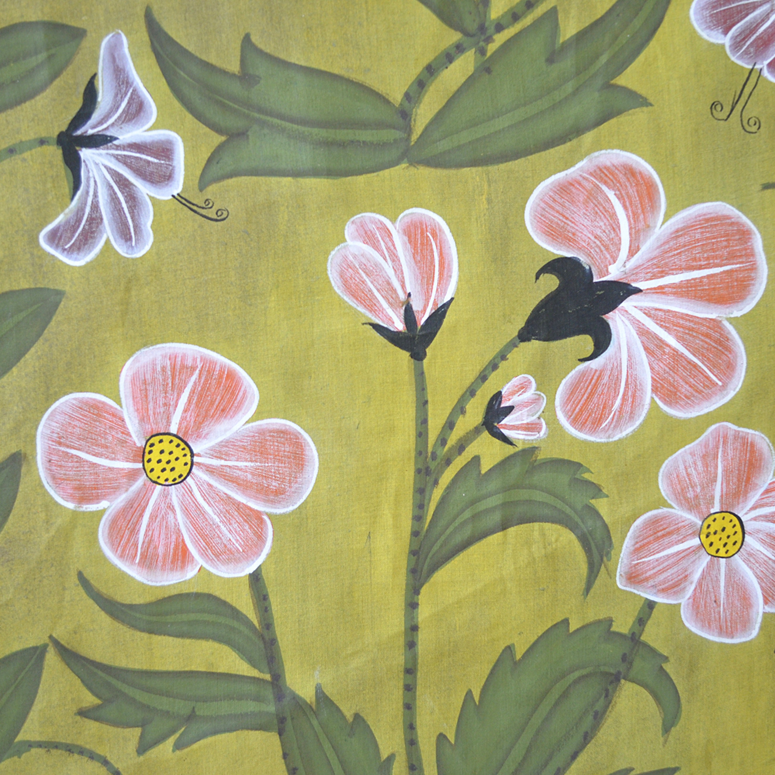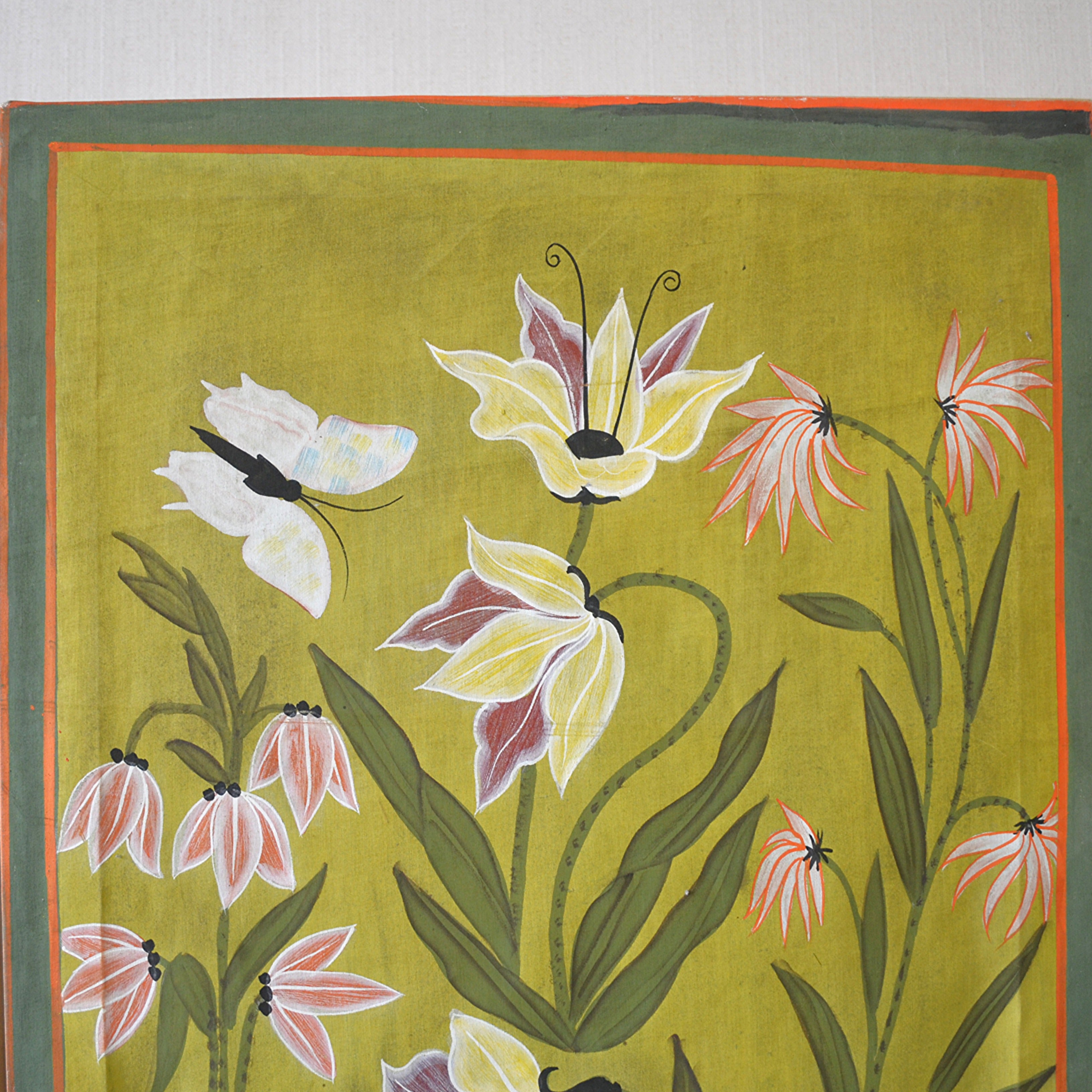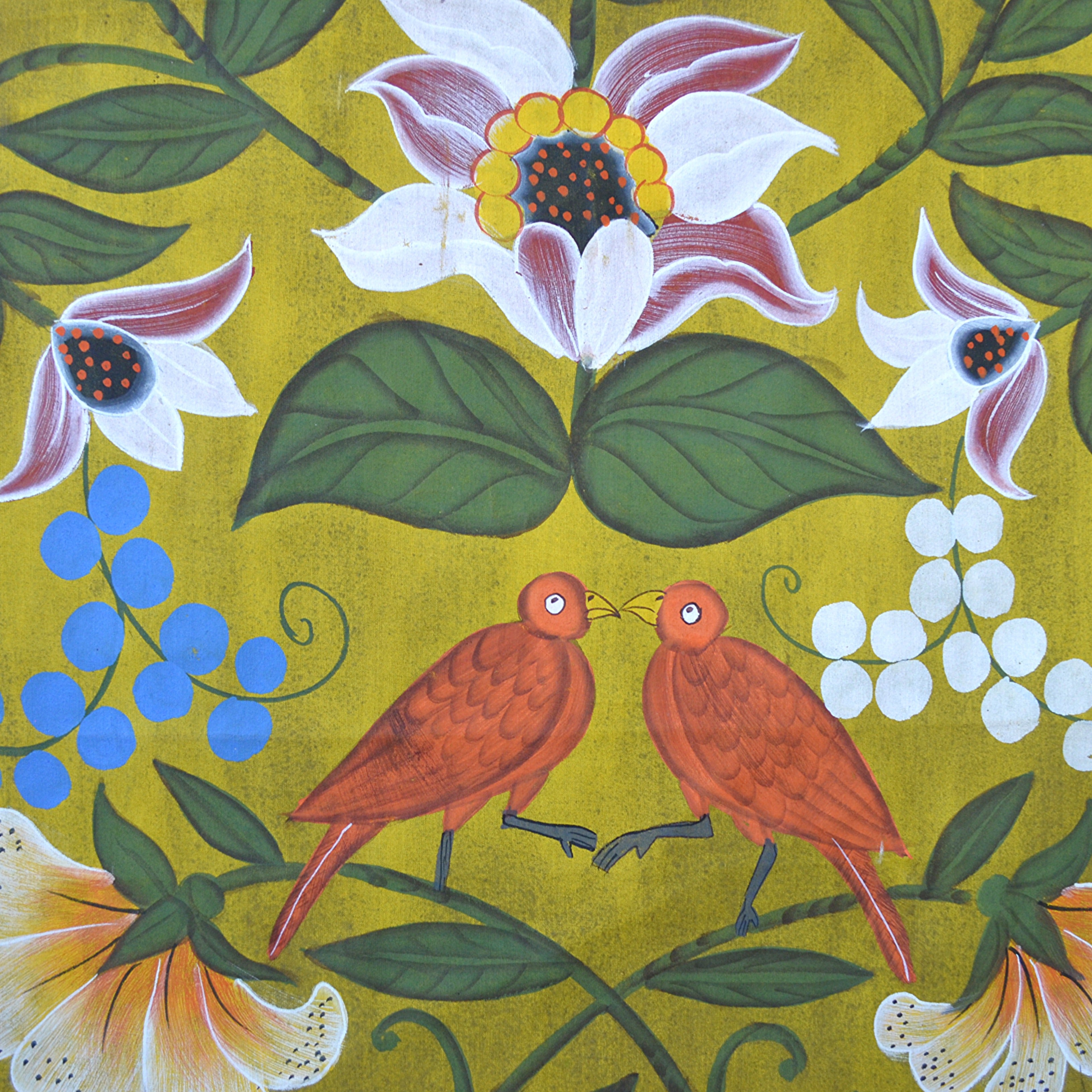 With exotic birds and flowers on linen with wooden frame.