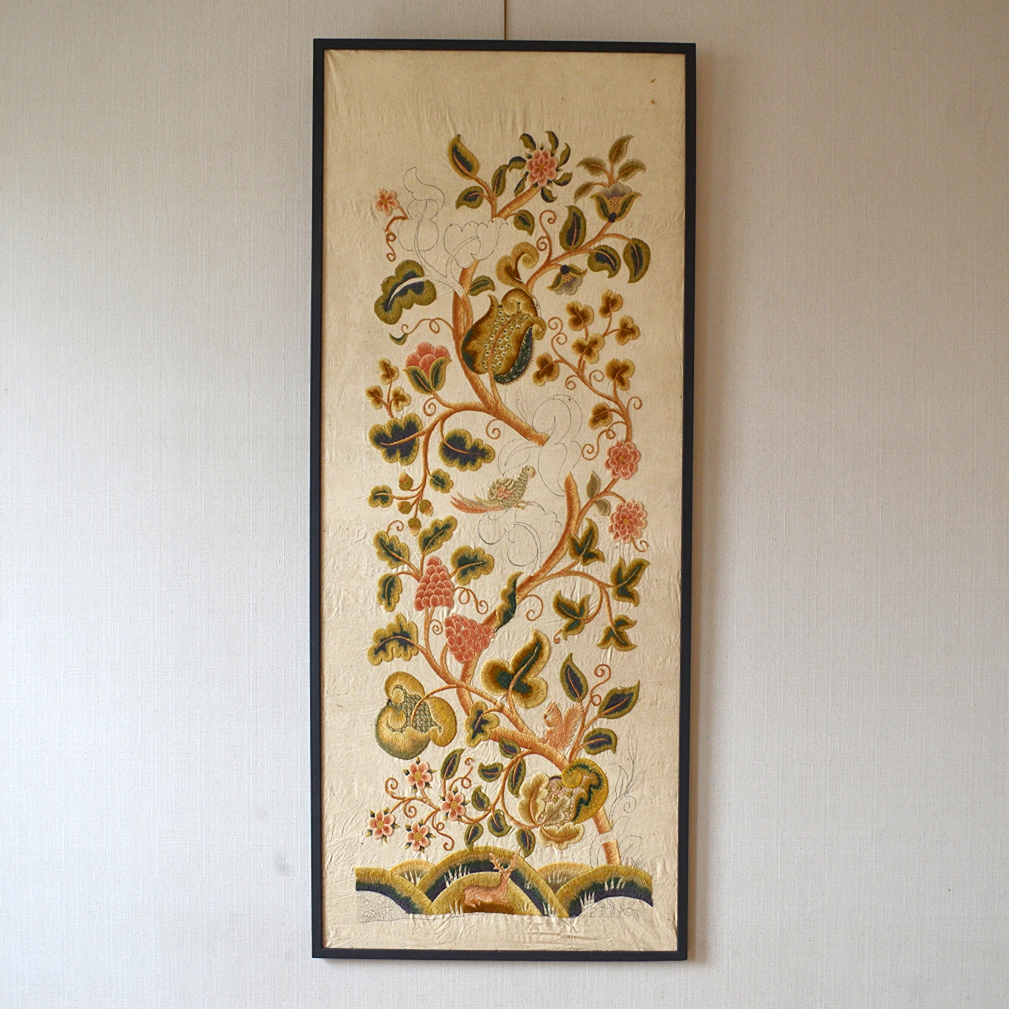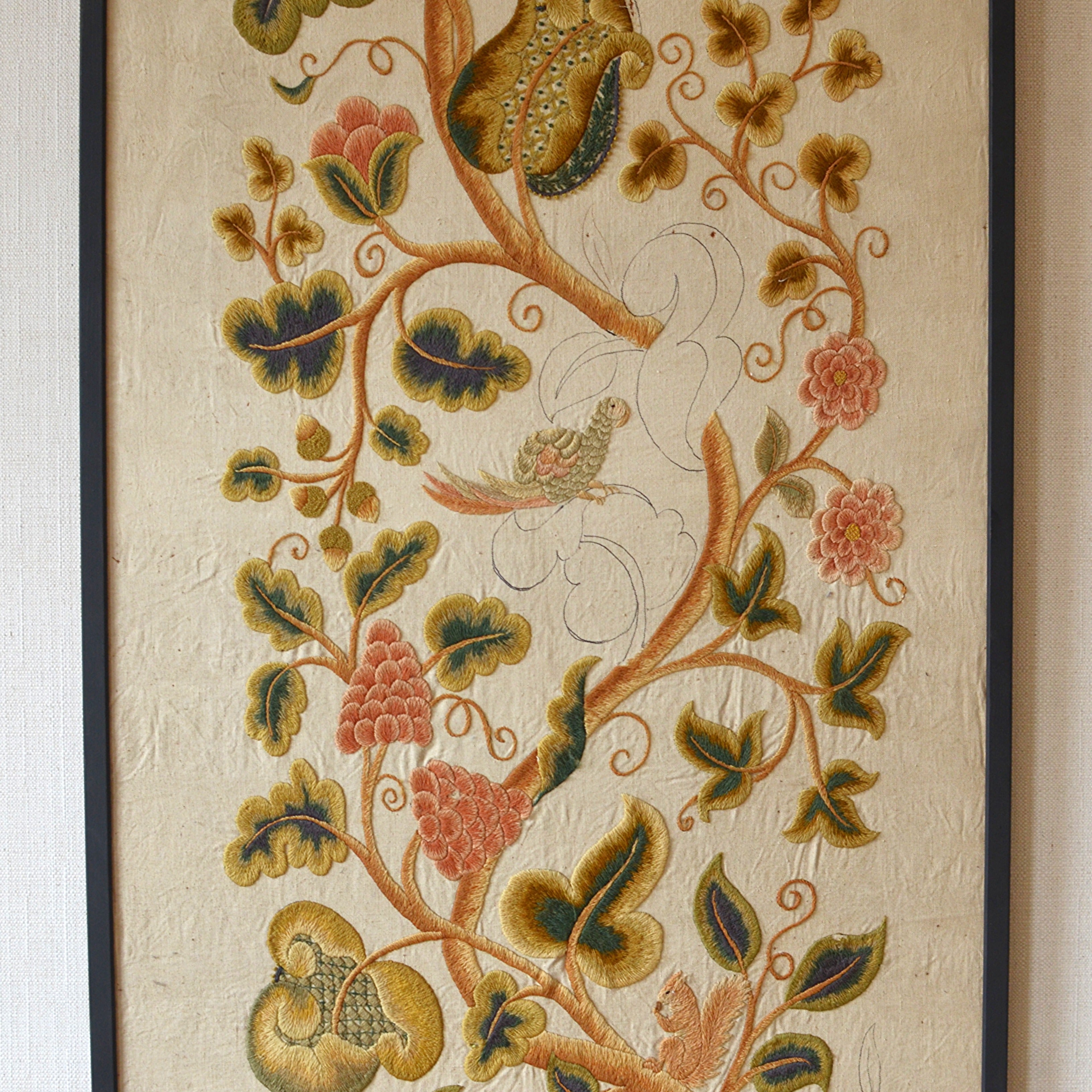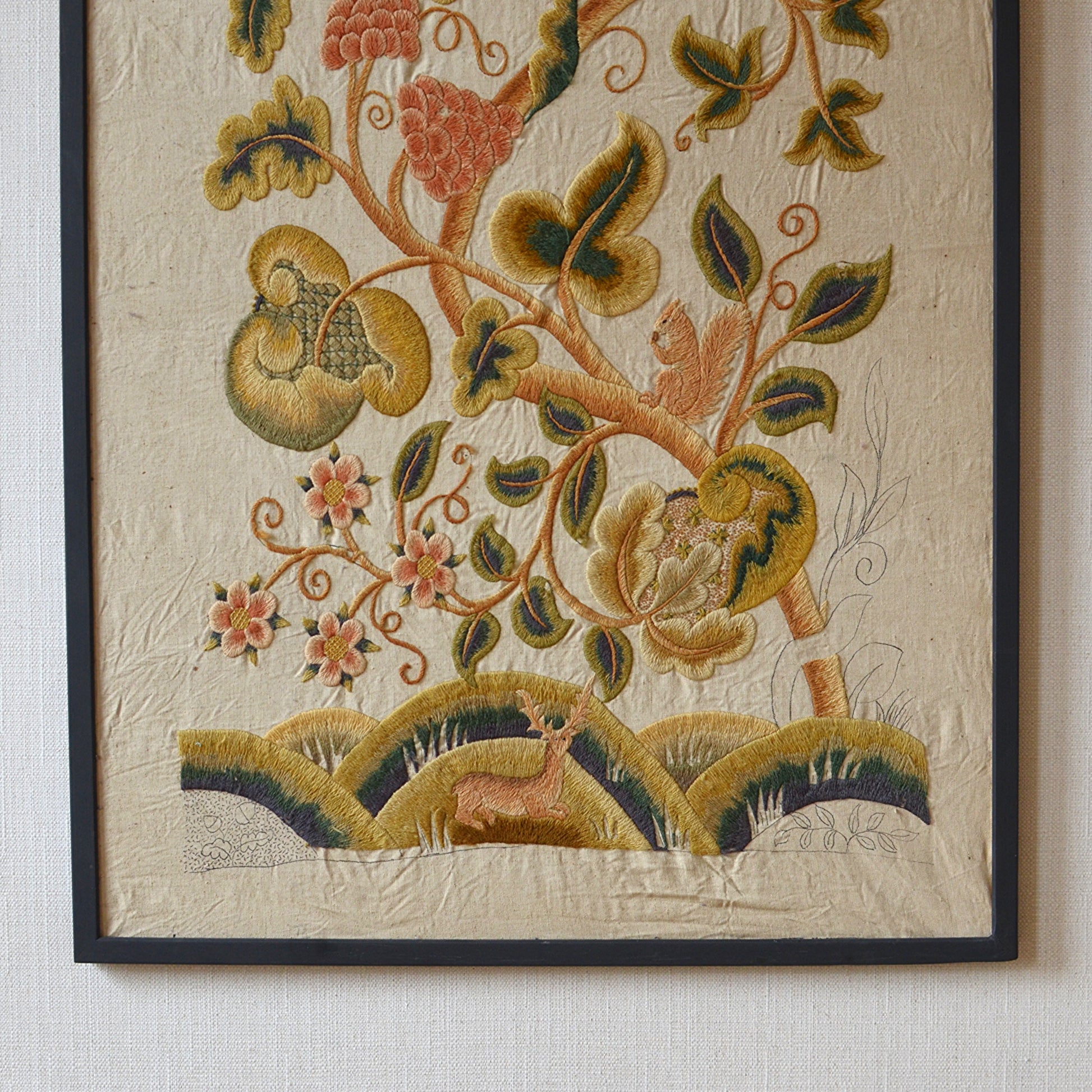 With floral and animal details with an unfinished tree of Life design, on a linen ground with an ebonised frame.