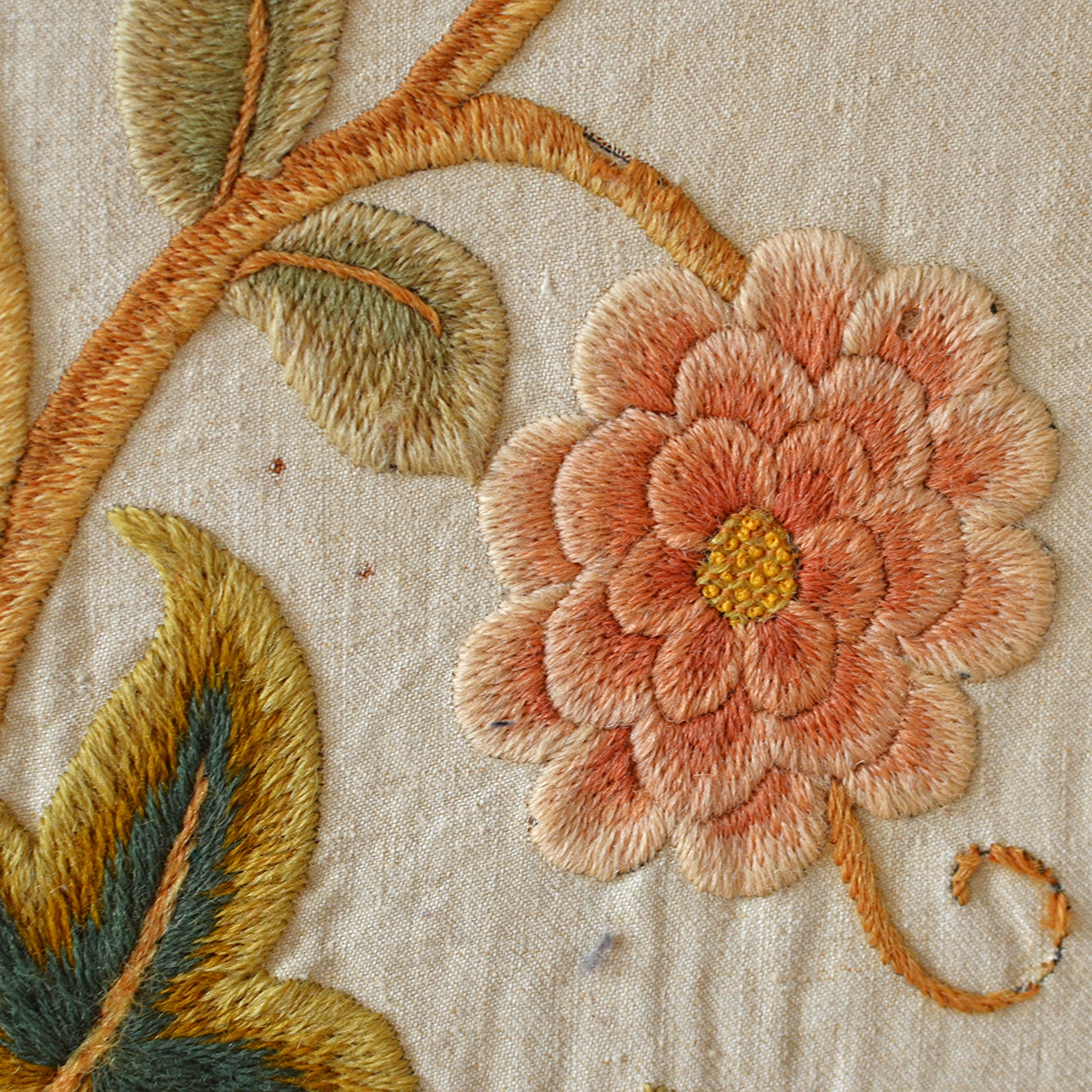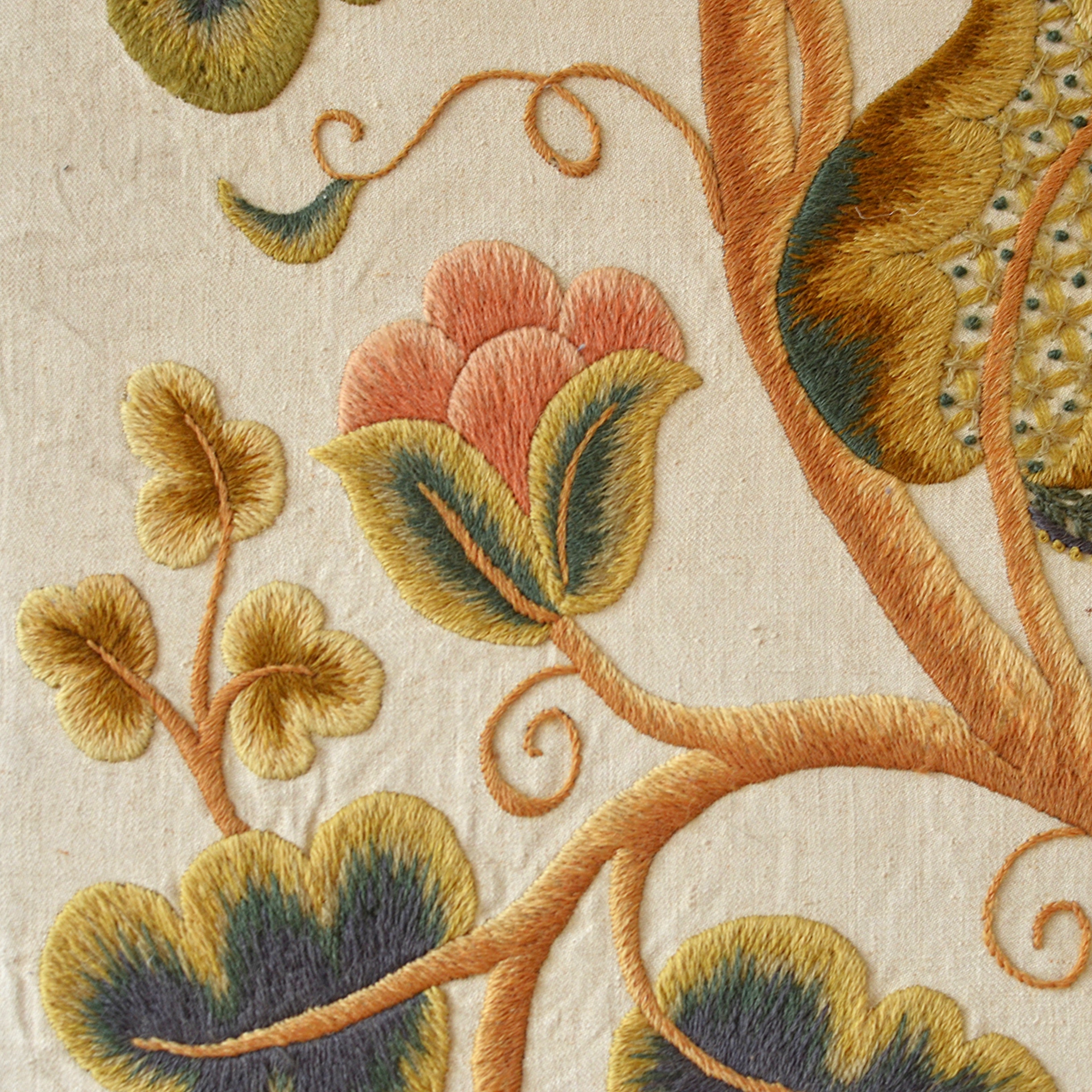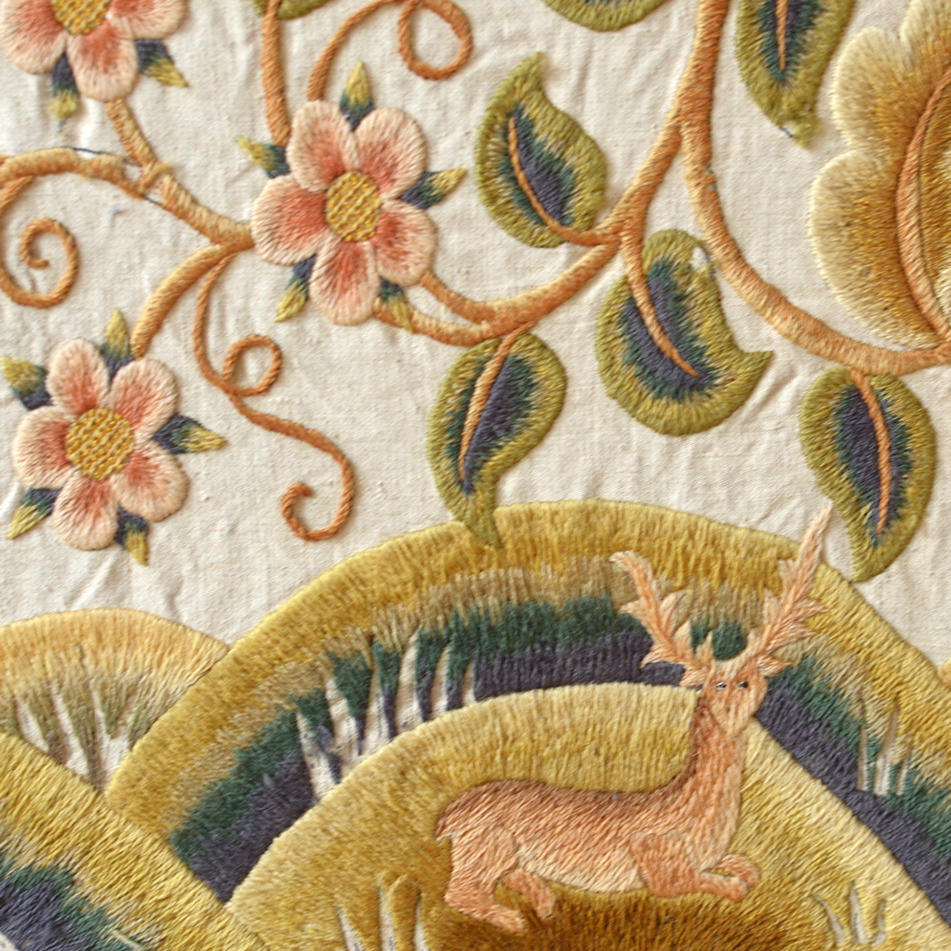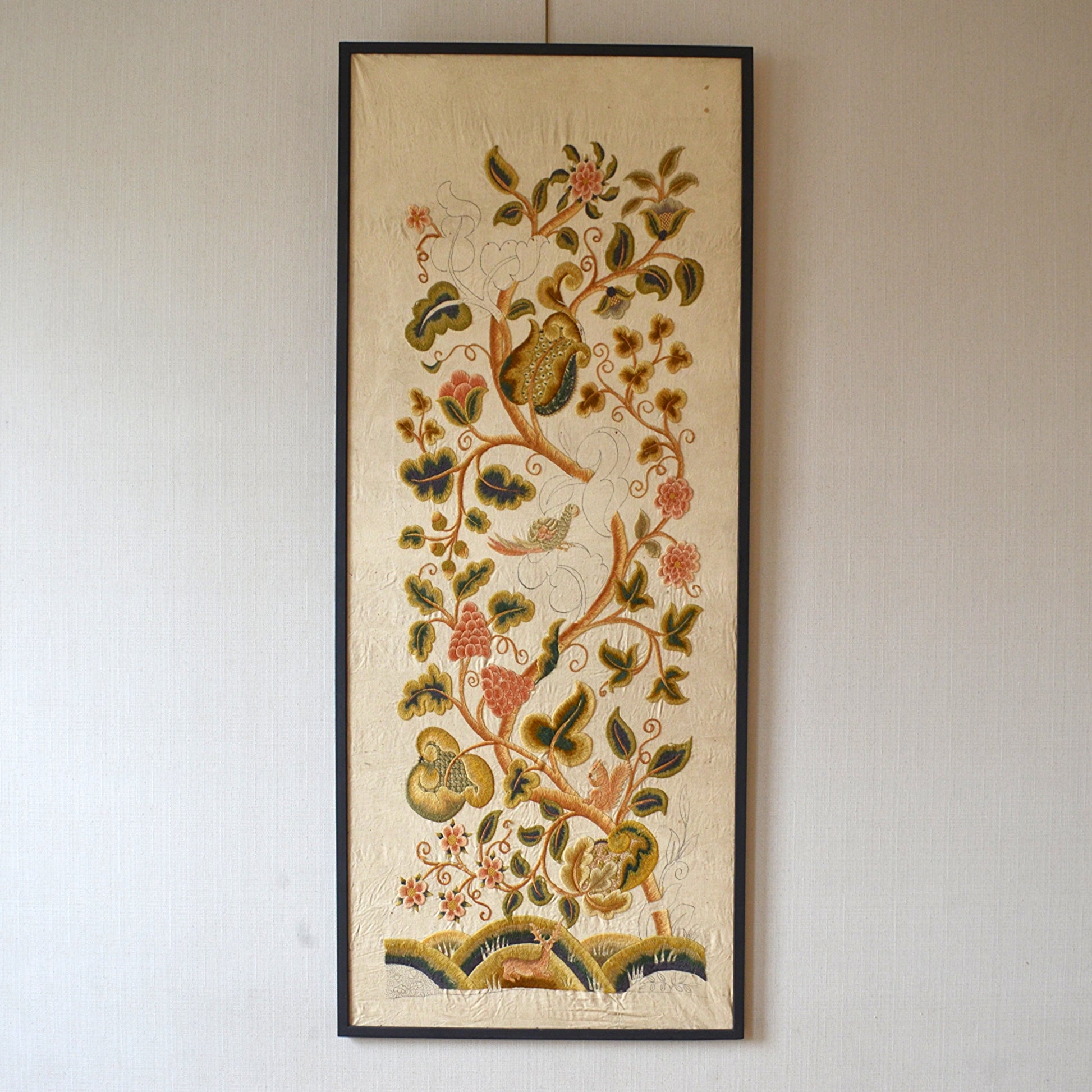 With floral and animal details with an unfinished tree of Life design, on a linen ground with an ebonised frame.