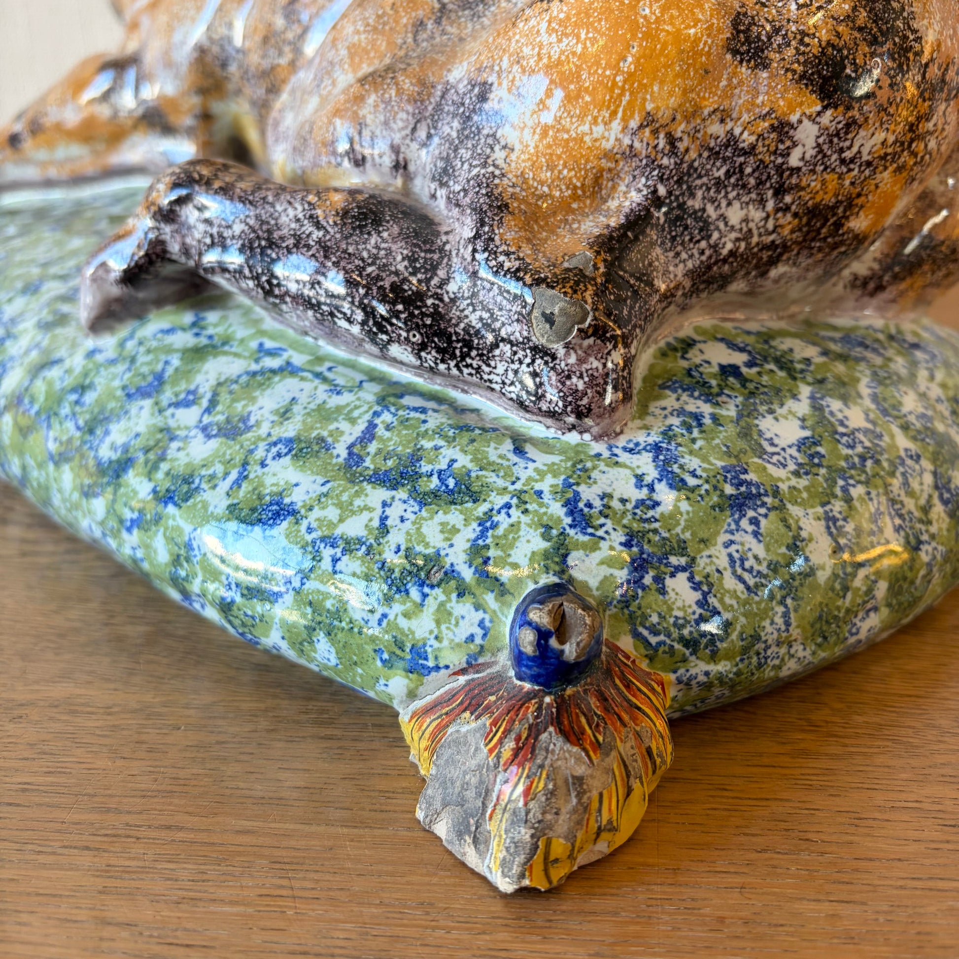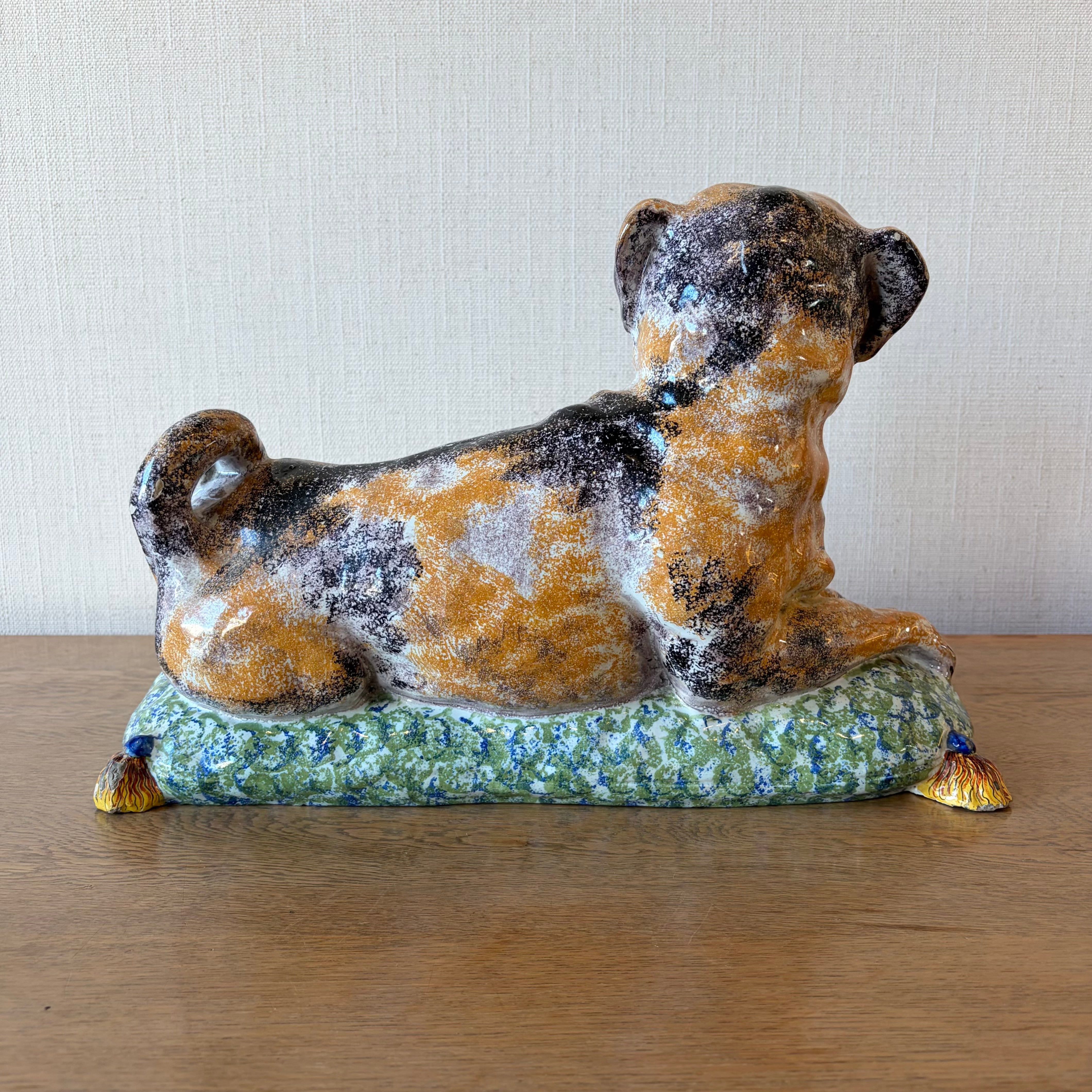 Faience pottery figure of a pug, recumbent on a tasseled cushion. Made in terre de Lorraine earthenware, developed in 1748 by Jacques Chambrette at the Lunéville pottery, founded in 1730 under King Stanislaus I of Poland.